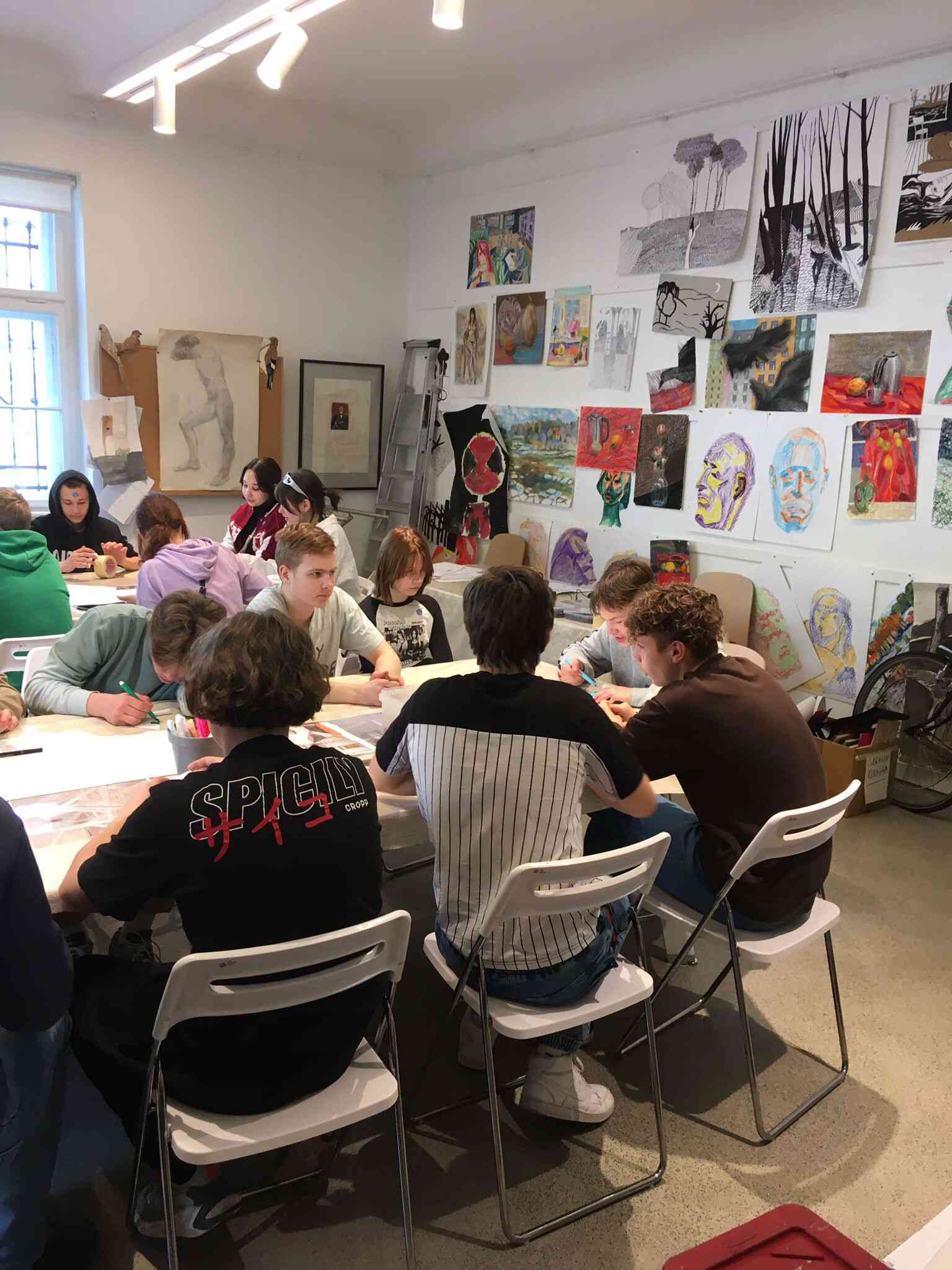 Izstāde atradās muzeja bēniņos, 4. stāvā. Mums tika iedota karte ar telpas attēlojumu, lai pēc numerācijas mēs varētu atrast katram darbam nosaukumu. Vēlāk mēs gājām uz nodarbību telpu un grupās veidojām savus mākslas darbus, par mūsdienu aktuālākajām problēmām.