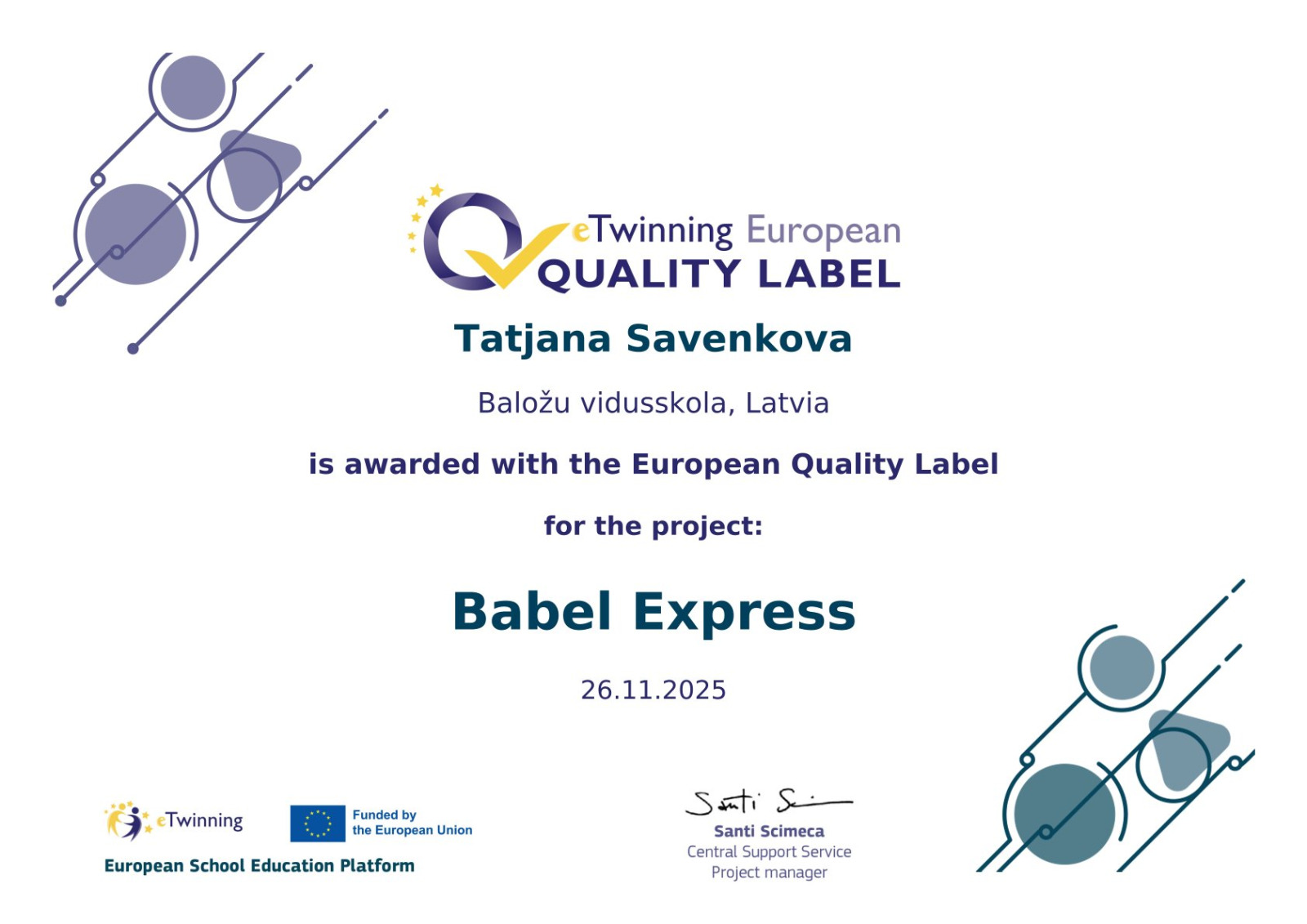 Starptautiskais eTwinning projekts “Babel Express” ir saņēmis Nacionālās un Eiropas kvalitātes zīmes. Mūsu skola saņēma šo atzinību pēc projekta veiksmīgas īstenošanas un izvērtēšanas: skolotāja Tatjana Savenkova sagatavoja un iesniedza projekta atskaites un galaproduktus eTwinning platformā, kurus izvērtēja nacionālie koordinatori pēc kritērijiem — sadarbības kvalitāte, pedagoģiskais pienesums, skolēnu iesaiste, digitālie materiāli un rezultātu publiskums. Pēc tam projekta kopējie rezultāti tika iesniegti Eiropas līmenim, un, atzīstot augsto kvalitāti, projekts tika apbalvots ar Eiropas kvalitātes zīmi. Šī atzinība apliecina mūsu skolas profesionālo darbu, skolēnu radošumu un veiksmīgu starptautisko sadarbību.
